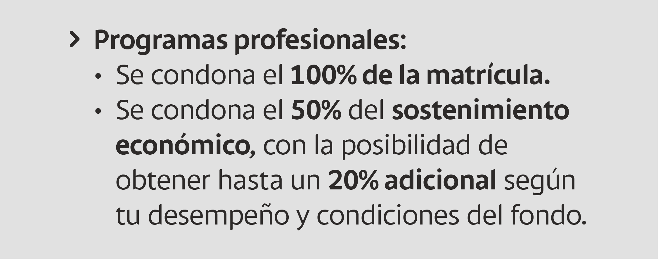 Podrás aplicar a la condonación como beca, lo que significa que no tendrás que devolver parte o la totalidad del dinero invertido en ti:​